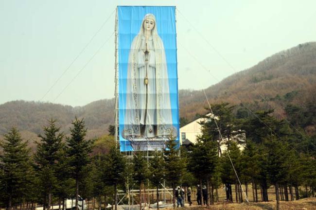 평화통일 기원을 위한 무신론극복의 파티마 발현 성모상을, 평화의 모후 청동성모상 건립(좌대높이 5m, 성모상 높이 15m)을 위한 본보기로 삼고자, 미리 사진판(6m x 20m 높이의 철골 가설대에, 폭 6m에 높이 15m 순수 성모상 사진판)을 제작하여 부착하고, 다각도로 청동성모상 제작 자료검토 준비 시작...(2012.04.16)(아시바 공사중)